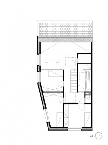 De linkervoorgevel wordt afgeschuind, waardoor de toegang van de woning extra wordt geaccentueerd en waardoor de ochtendzon ook in de woning kan binnen schijnen. Ook het rechtopstaand metselwerkverband in de voorgevel en zijgevel zorgt voor een accentuering van de toegang. De voorste zone is op het gelijkvloers ingericht als toegangszone en als slaapkamer. Aan de achterzijde bevinden zich de keuken en de leefruimte en is de woning gefocust op de achterliggende tuin. Een vide maakt een ruimtelijke connectie met de verdieping, waar zich de overige slaapkamers en het bureau bevinden. In de donkerste zone en centraal in de woning bevinden zich de bergingen en sanitair.